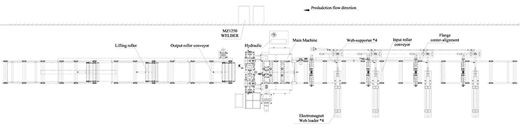 A standard 3-in 1 órás gerendahegesztési vonalak alapján hozzáad egy sor web-rakodót, amely 4 db mágneses rakodó kar és 4db web-támogató számára.